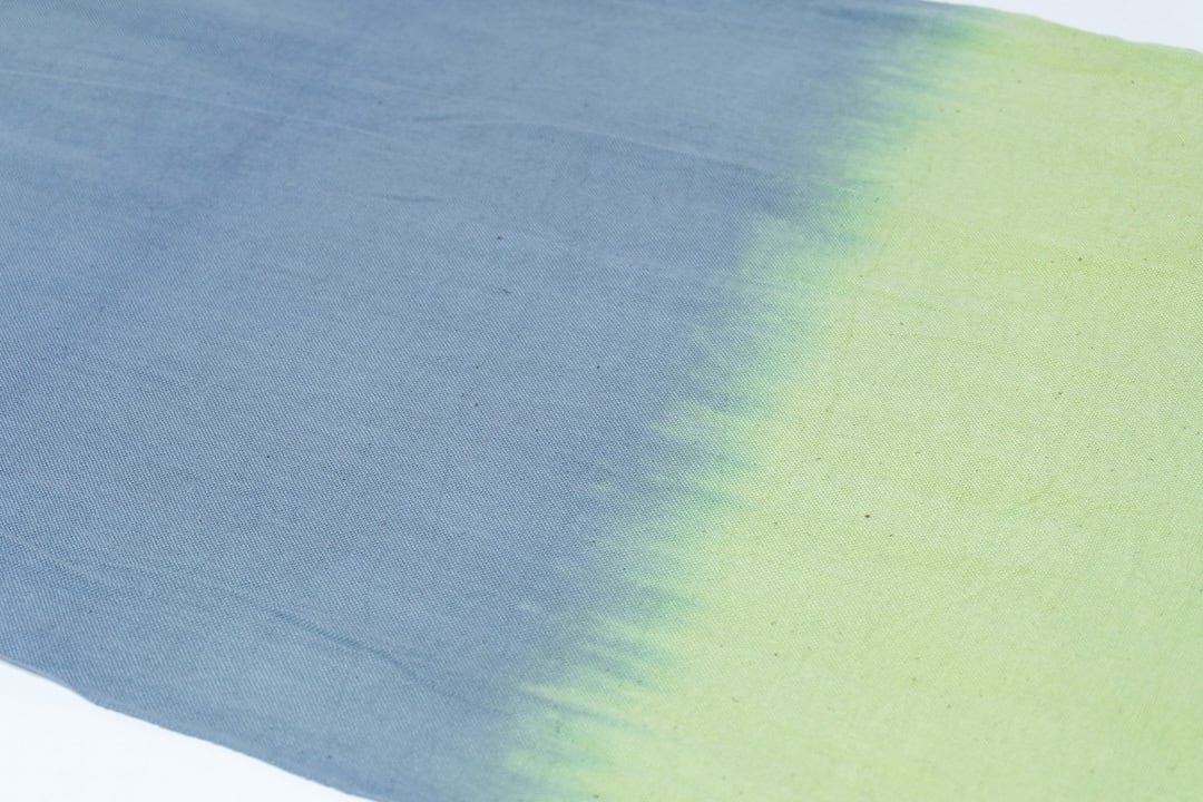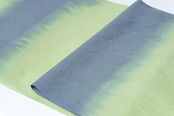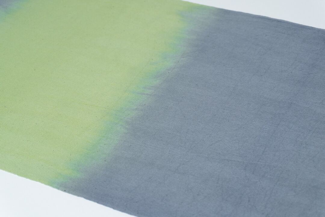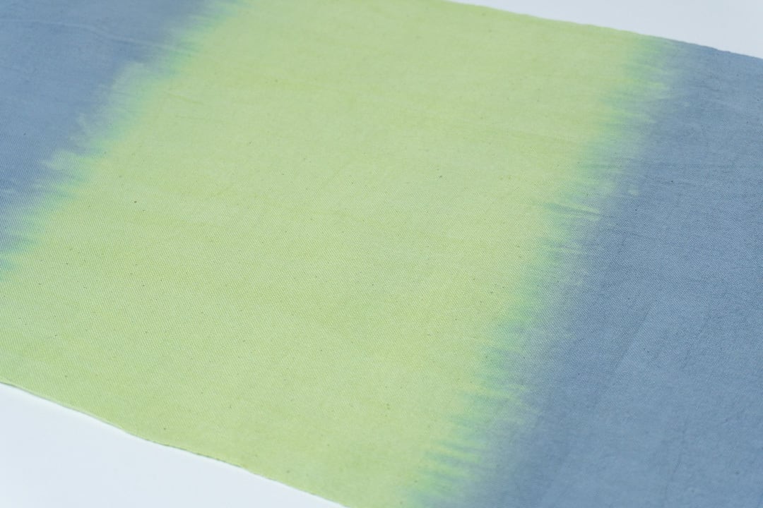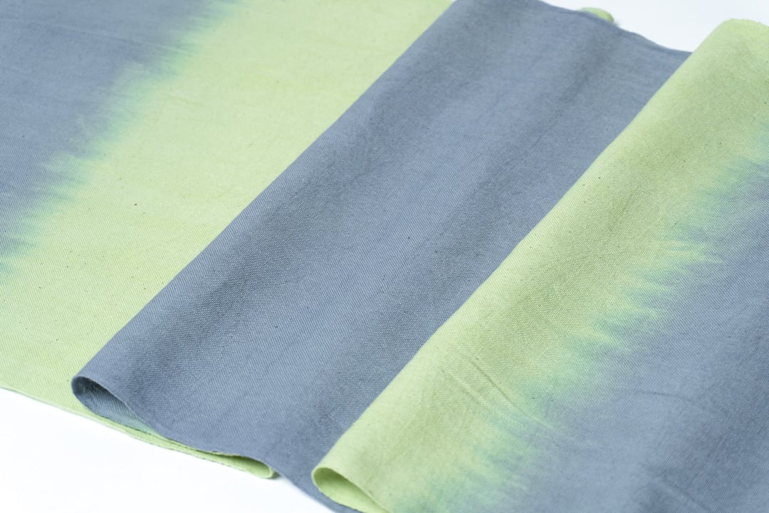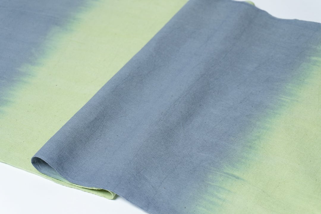 反物を畳み、折り重ねた生地の端から反応染料に浸して交互に染め上げていくことで、大胆なツートンカラーの段染めを実現。