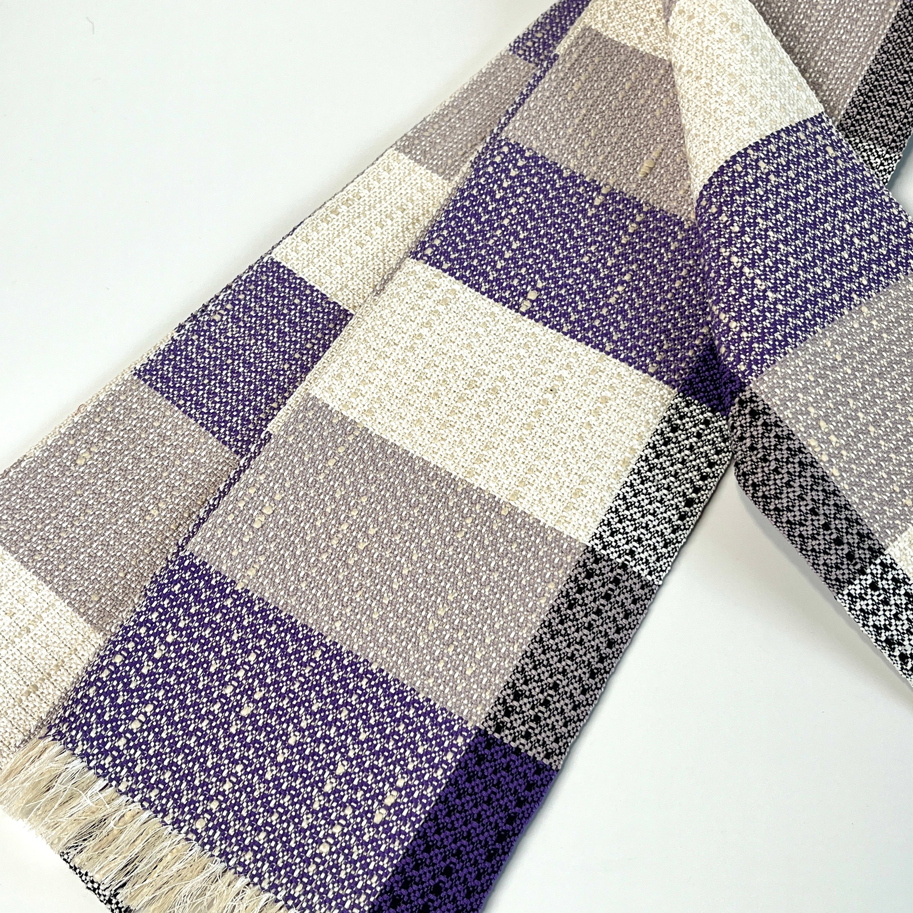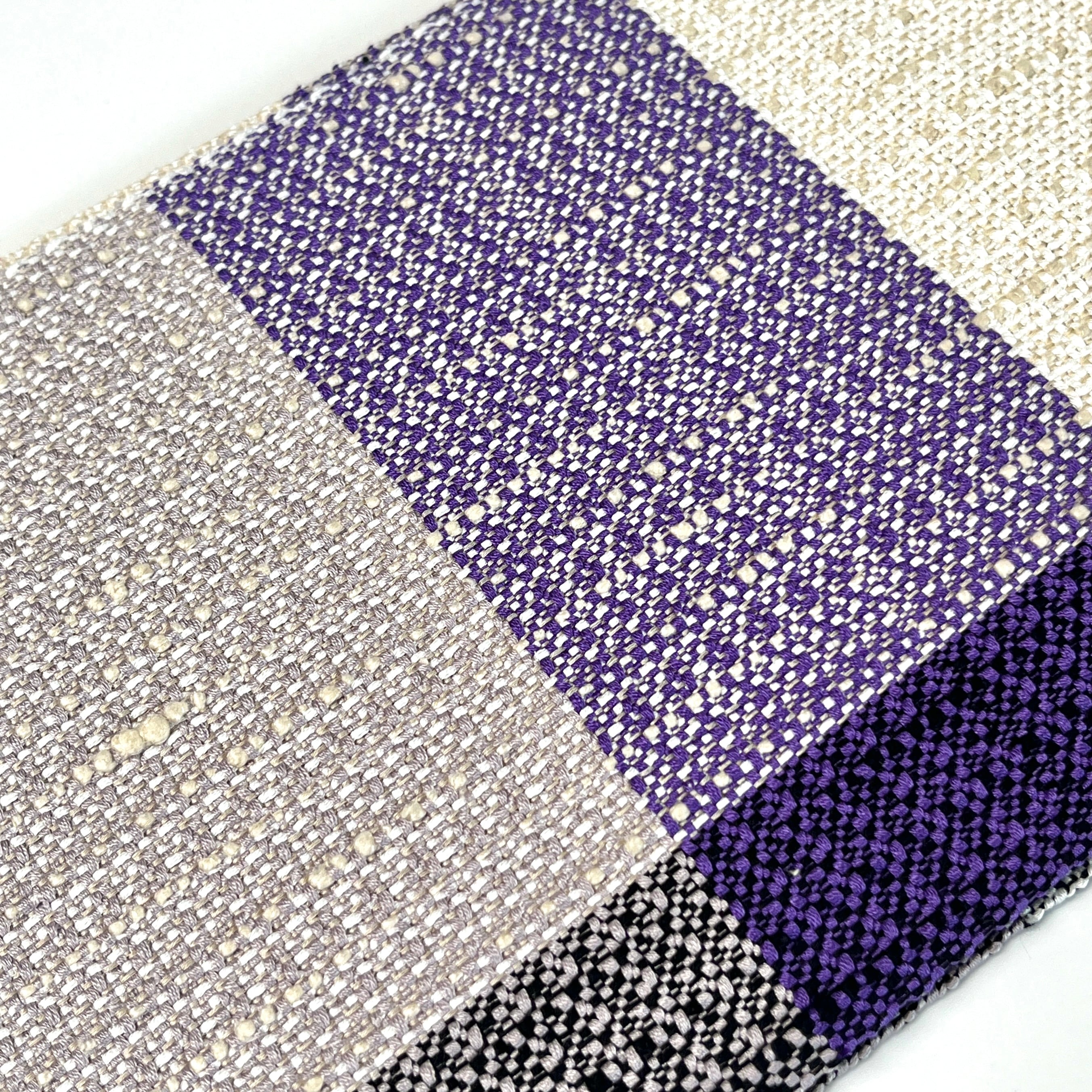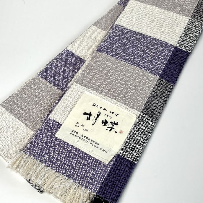 絹の光沢感と落ち着いた色調の大きな変わり格子の半巾帯です。